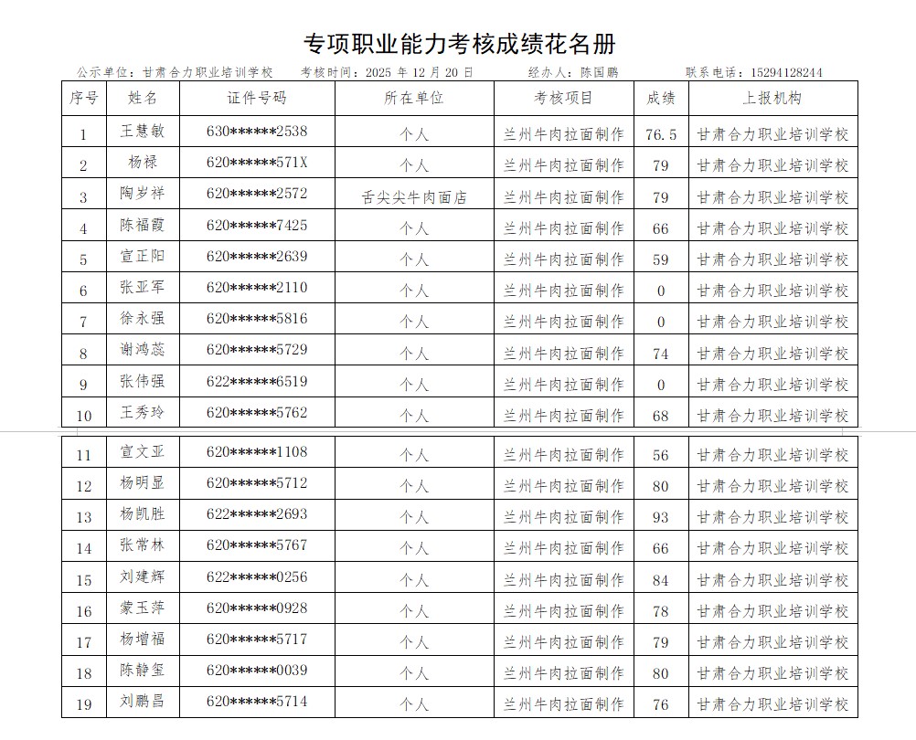 2025年12月20日,甘肃合力职业培训学校组织了兰州牛肉拉面制作专项职业能力考核,按照相关工作程序及要求,现面向社会公示本次考试成绩,公示时间为:2026年1月5日至2026年1月9日,共计5天。